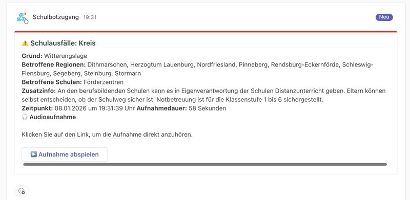 Ein Tag im Leben eines Daten- und KI-Journalisten: Für morgen wird in Norddeutschland Schnee erwartet. Das Bildungsministerium in Kiel hat eine Hotline eingerichtet, die Informationen darüber bereitstellt, in welchen Regionen Schulen geschlossen sind.