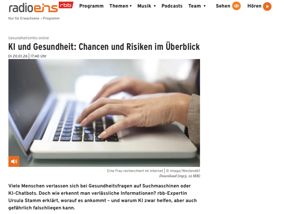 „Viele Menschen verlassen sich bei Gesundheitsfragen auf Suchmaschinen oder KI‑Chatbots. Doch wie erkennt man verlässliche Informationen? rbb‑Expertin Ursula Stamm erklärt, worauf es ankommt – und warum KI zwar helfen, aber auch gefährlich falschliegen kann.